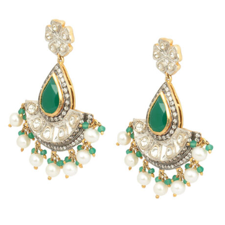 Silver Gold Plated Crystal Polki & Green Onyx Pear Dangler Earring