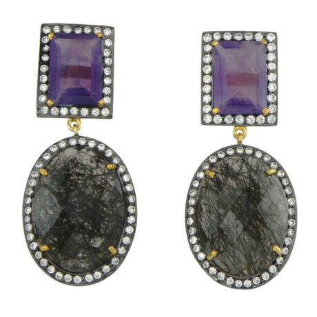 Silver Gold Plated wtih Black Rhodium Black Rutile, Amethyst & Zircon Earring