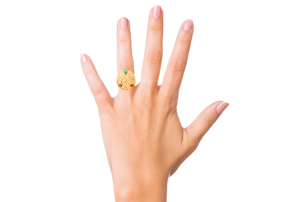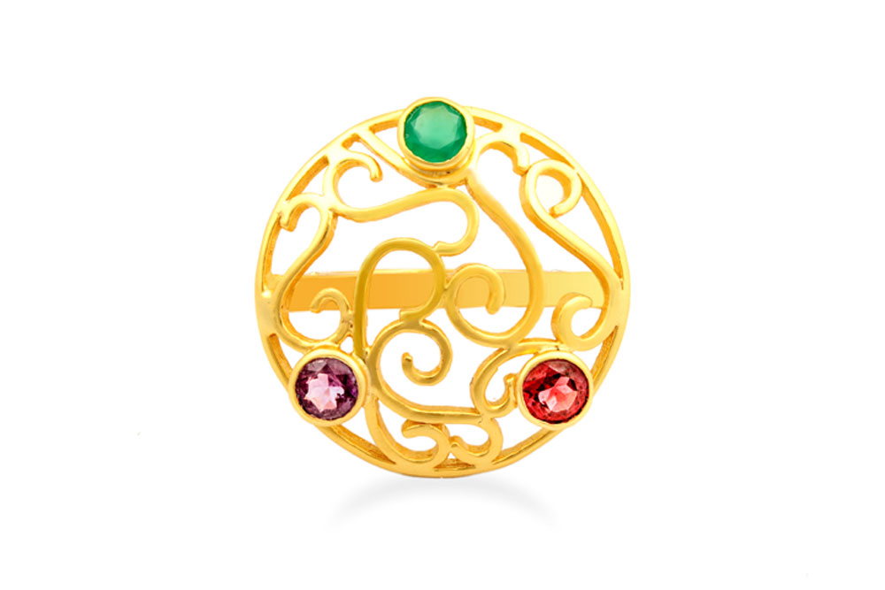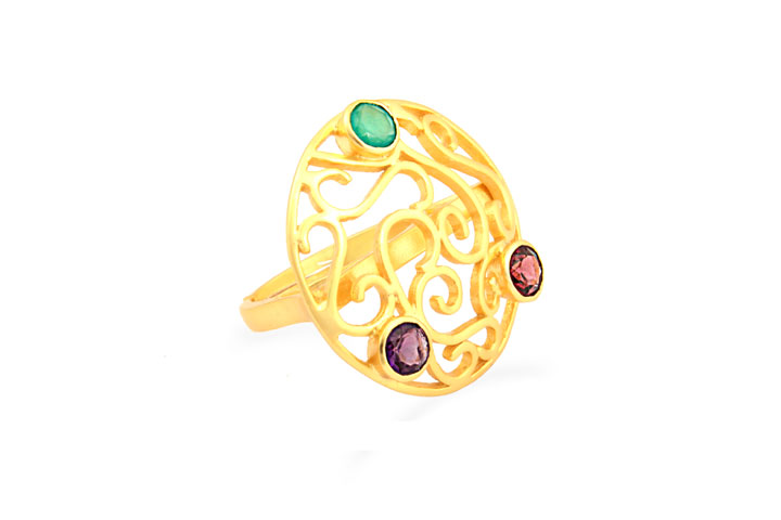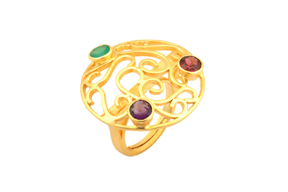 Beautiful Designer Silver Gold Plated Green Onyx, Amethyst & Garnet Ring